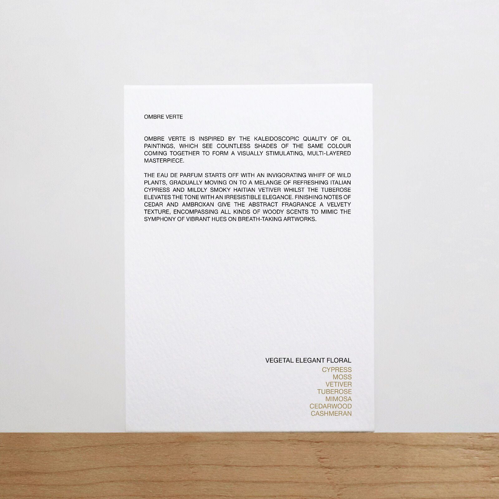 The Eau de Parfum starts off with an invigorating whiff of wild plants, gradually moving on to a melange of refreshing Italian cypress and mildly smoky Haitian vetiver whilst the tuberose elevates the tone with an irresistible elegance. Finishing notes of cedar and ambroxan give the abstract fragrance a velvety texture, encompassing all kinds of woody scents to mimic the symphony of vibrant hues on breath-taking artworks.